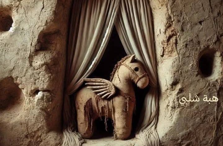 فلما سيدنا النبي صلى الله عليه وسلم دقق النظر في الألعاب لمح من ضمنهم حصان مصنوع من الجلد أو القماش وله جناحان، فشاور صلى الله عليه وسلم عليه وسأل السيدة عائشة وقالها:”ما هذا الذي أرى وَسَطَهُنَّ ”