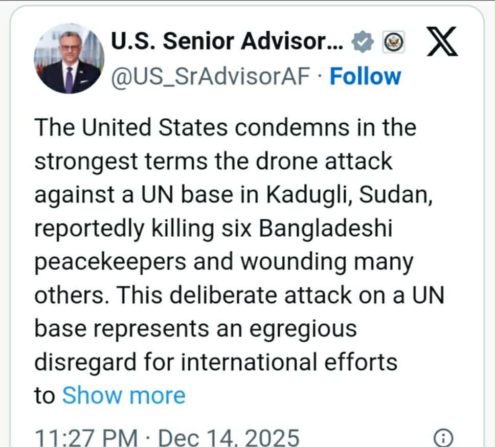 أعلن بولس عبر منشور على منصة “إكس” أن الولايات المتحدة تدين بأشد العبارات الهجوم بالطائرات المسيّرة على قاعدة الأمم المتحدة في السودان، مؤكداً أن هذا الاعتداء يمثل تجاهلاً صارخاً للجهود الدولية الرامية إلى تعزيز السلام والأمن. وشدد على ضرورة توقف القتال فوراً ومن دون شروط مسبقة، مع ضمان عدم استهداف كوادر الأمم المتحدة والسماح بدخول المساعدات الإنسانية بشكل آمن.