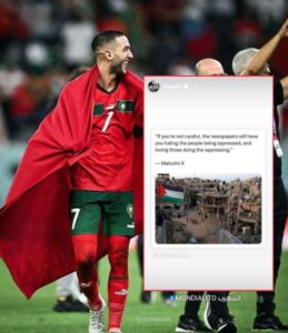 أما حكيم زياش الدولي المغربي فنشر بوست يتضامن مع غزة وهو يحمل صورة توضح الدمار الناجم عن القصف الاسرائيلي وايضا تضامن من المغرب مع القضية الفلسطينية الدولي نايف أكراد لاعب وستهام الإنجليزي .