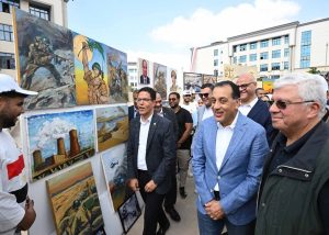 كما شاهد رئيس الوزراء ومرافقوه، معرضاً فنياً للطلاب بعنوان “الفن يجسد مسيرة بناء الجمهورية الجديدة” بالمدرج الروماني بالجامعة، تضمن لوحات فنية عبر الطلاب من خلالها عن فخرهم بوطنهم، وتضمنت لوحاتهم مشاهد مختلفة للنهضة العمرانية الكبرى التي تشهدها مصر في مختلف المجالات، فضلاً عن المشروعات القومية في مجالات التعليم والصناعة والزراعة والبنية التحتية فى مبادرة لتسجيل حجم الجهد المبذول لبناء الجمهورية الجديدة.