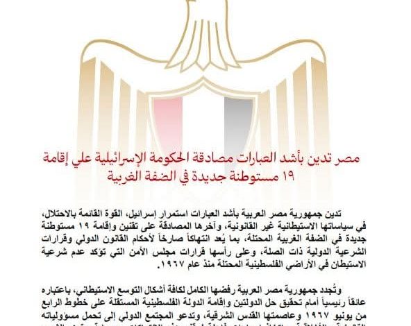 مصر تدين بأشد العبارات مصادقة الحكومة الإسرائيلية على إقامة ١٩ مستوطنة جديدة في الضفة الغربية