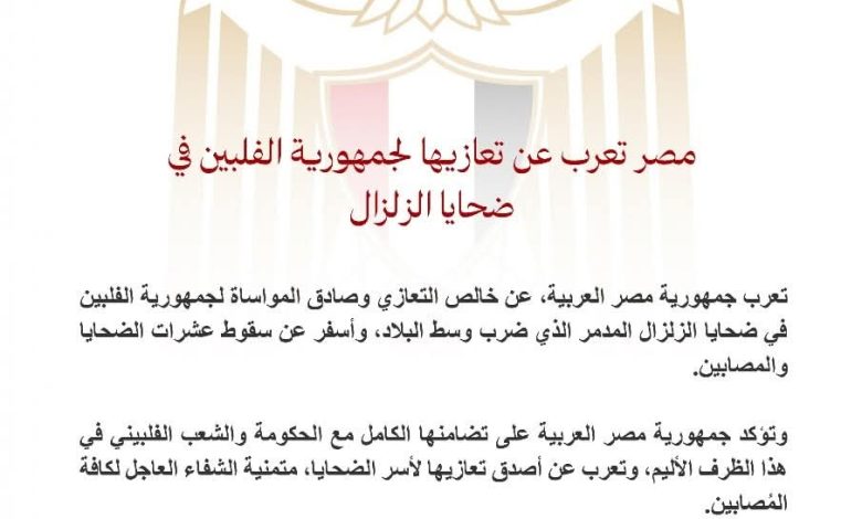 تعرب جمهورية مصر العربية، عن خالص التعازي وصادق المواساة لجمهورية الفلبين في ضحايا الزلزال المدمر الذي ضرب وسط البلاد، وأسفر عن سقوط عشرات الضحايا والمصابين.