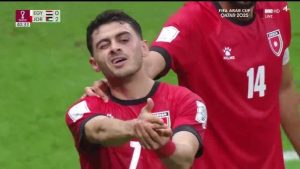وبعد دقيقة واحدة حرم القائم الأيسر لمنتخب الأردن، مروان حمدي من هدف أول بعد تسديدة قوية من خارج منطقة الجزاء.