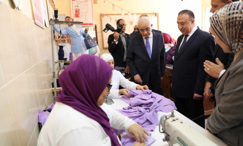 وقد تفقد الوزير والمحافظ ورش العمل لقسم الملابس الجاهزة داخل المدرسة، واستعرضوا تفاصيل إنتاج الطالبات للزي المدرسى للمحافظة .